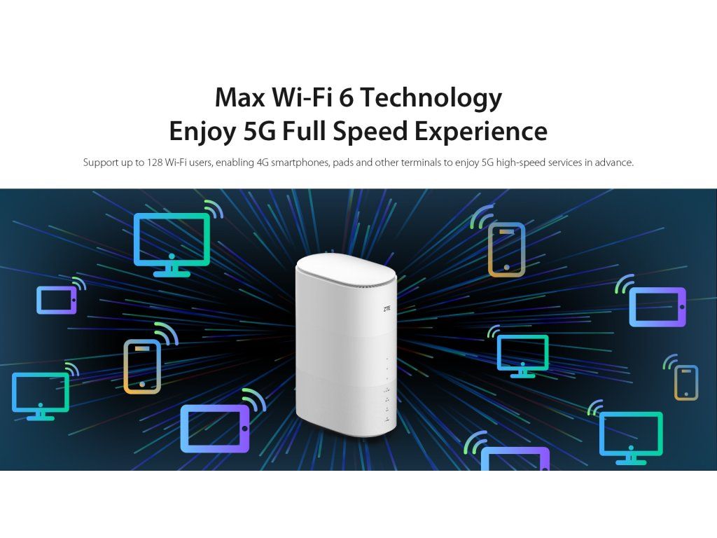 Stolní modem ZTE MC801A s vestavěným Wi-Fi směrovačem je řešení pro připojení domácnosti nebo malé kanceláře k internetu prostřednictvím mobilní sítě LTE (4G) nebo 5G.
