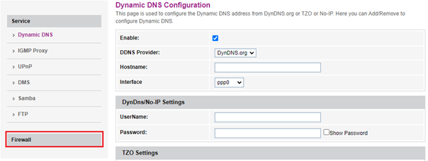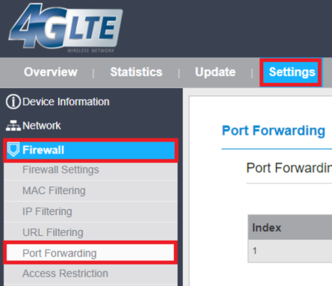 - Po přihlášení v horním menu vyberte Settings. V levém svislém menu zvolte Firewall a poté Port Forwarding.
