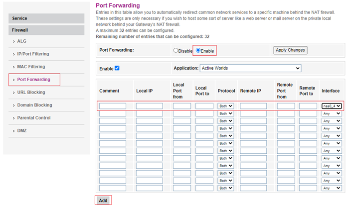 - Povolte funkci Port Forwarding zaškrtnutím pole Enable a přidejte nové pravidlo.