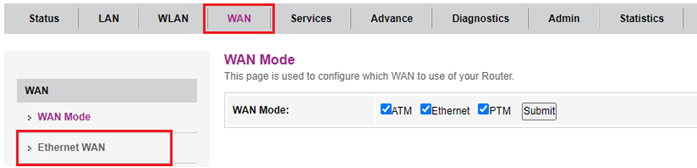 - Nyní v modemu Comtrend nastavte statickou IP adresu na WAN rozhraní. V horním menu pokročilého nastavení vyberte WAN a následně Ethernet WAN.