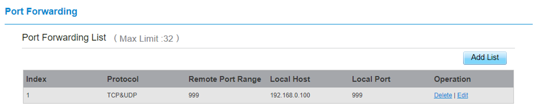 Povolte funkci Port Forwarding zaškrtnutím pole Enable a přidejte nové pravidlo.