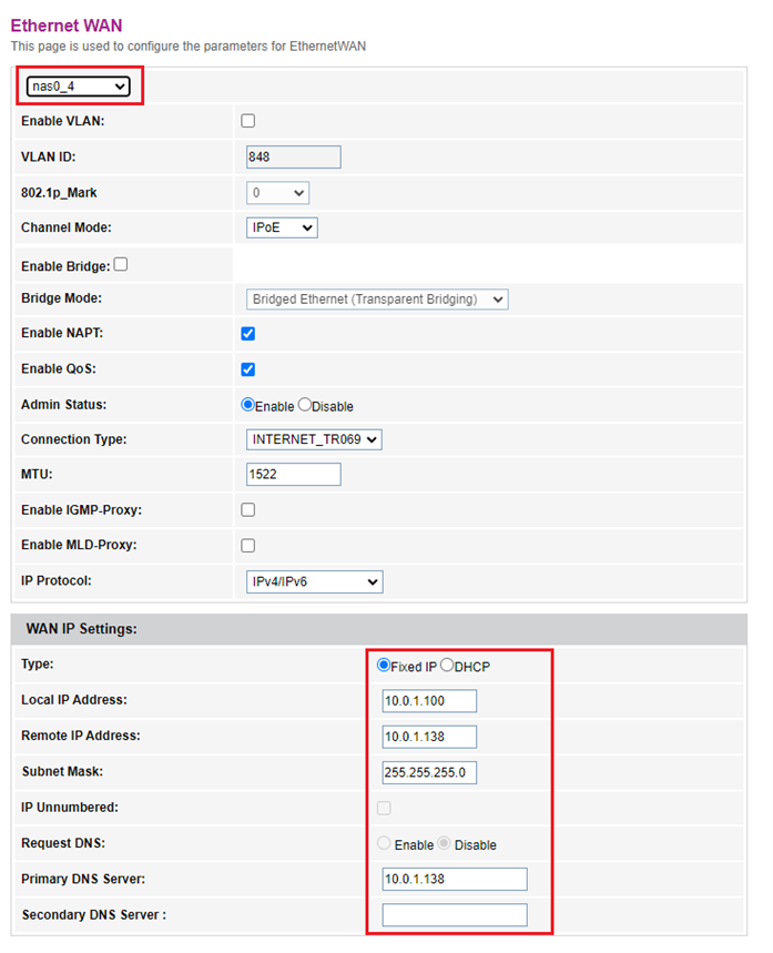 Pro úpravu WAN připojení vyberte správné WAN rozhraní. V případě WTTx zvolte nas0_4. V části WAN IP Settings přepněte nabídku z DHCP na Fixed IP. Položky Local IP address, Remote IP address, Subnet Mask a DNS server vyplňte podle potřeby sítě. Nastavení uložte kliknutím na Apply Changes.