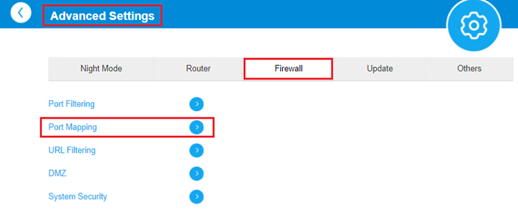 - Po přihlášení ve spodní části obrazovky vyberte Advanced Settings. Ve vodorovném menu zvolte Firewall a poté Port Mapping.